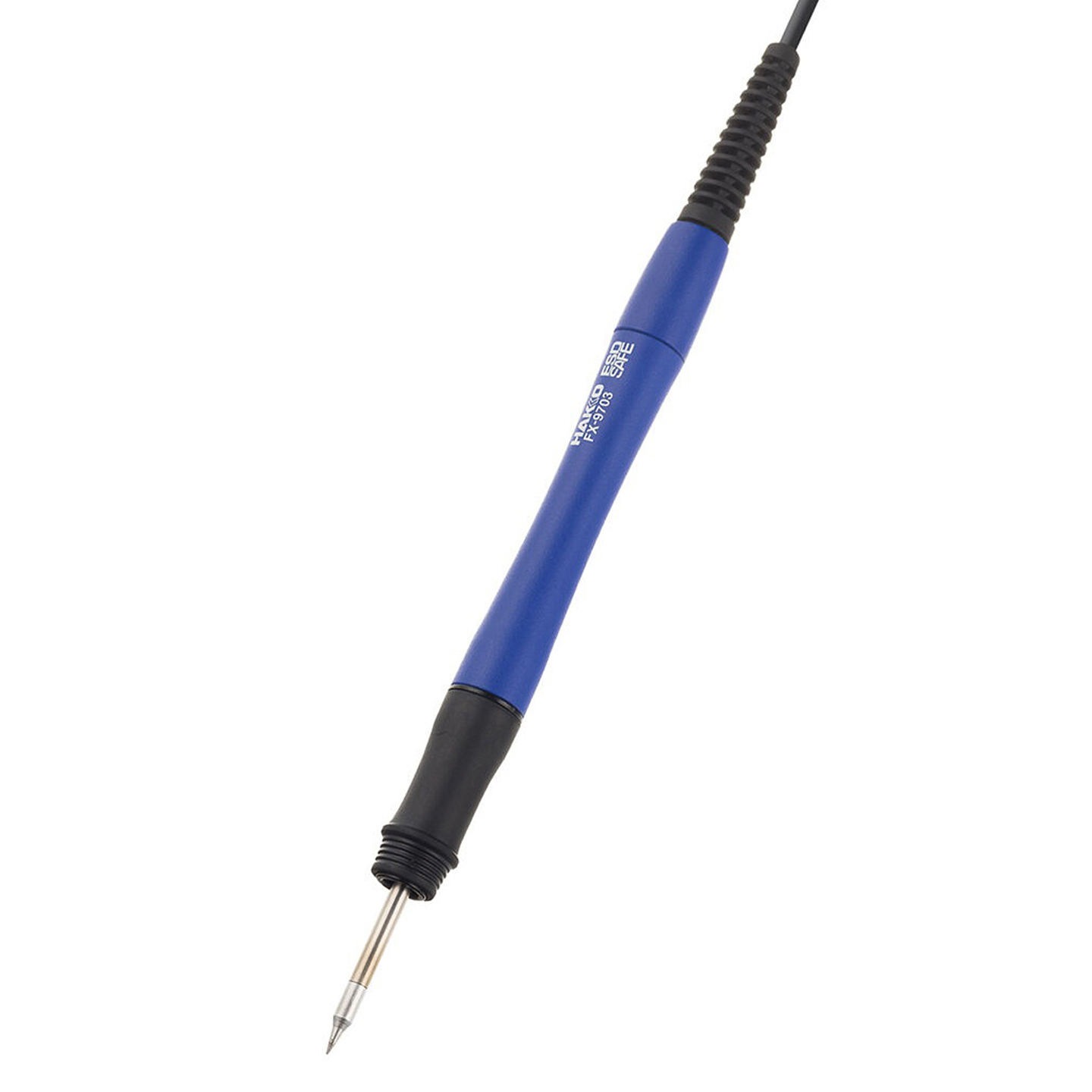 Der FX-9703 überzeugt durch seine extrem schlanke Bauweise und ein besonders leichtes Handstück mit nur 15 g Gewicht. Der kurze Abstand von 27 mm zwischen Griff und Lötspitze ermöglicht eine besonders direkte und präzise Führung – vergleichbar mit einem Zeichenstift. Unterstützt wird dies durch das flexible Anschlusskabel mit nur 3,6 mm Durchmesser, das die Bewegungsfreiheit selbst bei Arbeiten unter dem Mikroskop oder in dicht bestückten Leiterplatten nicht einschränkt.